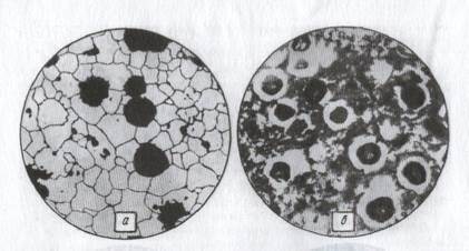 Рис. 8. Микроструктура высокопрочных чугунов на ферритной (а) и ферритно-перлитной (б) основах.