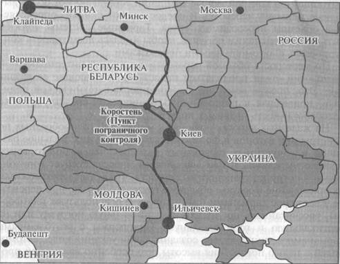 В качестве примера приведем открытые в 2003 г. на постоянной основе оператором Украинский государственный центр транспортного сервиса (УГЦТС) «Лиски» совместно с зарубежными партнерами два регулярных контрейлерных направления (поезда). Один соединяет порт Иьичевск (Украина) на Черном море с портом Клайпеда (Литва) на Балтике при протяженности маршрута 1733 км, времени в пути 56 ч 30 мин (рис. 2.5.7); а другой — города Киев и Славкув (Польша) при протяженности 1028 км, времени в пути 38 ч 41 мин. В стоимость перевозки по данным маршрутам включено оформление провозных документов, провоз одного АТС на специализированной железнодорожной платформе, проезд водителей в пассажирском вагоне, прохождение таможенного оформления и охрана АТС на всем протяжении пути. для проезда водителей предусмотрен пассажирский вагон и вагон-ресторан (кафе), по отношению к водителям применяется режим пограничного и таможенного контроля, предусмотренный действующими законодательствами Украины и Польши.