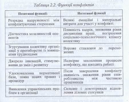 Сучасна точка зору полягає в тому, що навіть в організаціях з ефективним управлінням деякі конфлікти не лише можливі, а навіть можуть бути бажаними. Так, у багатьох ситуаціях конфлікт допомагає виявити різноманітність точок зору, дає додаткову інформацію, допомагає виявити більшу кількість альтернатив чи проблем. Це робить процес прийняття рішень більш ефективним, оскільки дає людям можливість висловити свої думки і тим самим задовольнити свої особисті потреби в повазі і владі. Конфлікт також може привести до більш ефективного виконання планів, стратегій і проектів, оскільки вислуховування різних точок зору щодо цих документів відбувається до їх фактичного виконання. Проте можлива й інша, негативна сторона конфлікту. Наприклад, людина на засіданні комітету (ради) сперечається лише тому, що не сперечатися вона не може. При цьому конфлікт заважає досягненню мети організації в цілому. Таким чином, конфлікт може бути функціональним і вести до підвищення ефективності організації та дисфунк-ціональним, що призводить до зниження особистої задоволеності, групового співробітництва і ефективності організації. Дослідження в галузі функціональних можливостей конфліктів вперше були проведені Л. Козером і Р. Дарен-дорфом. Вони узагальнили позитивні і негативні функції конфліктів (табл. 2.2). Розглянемо позитивні функції.