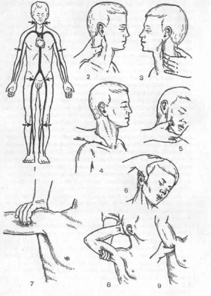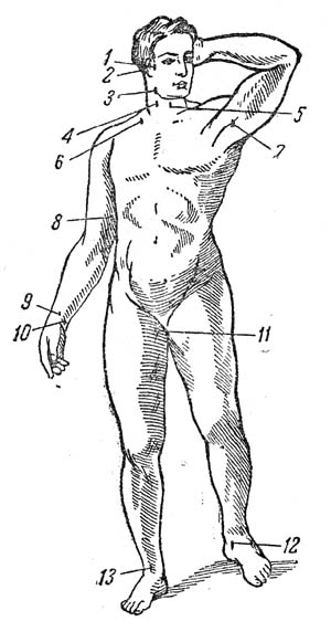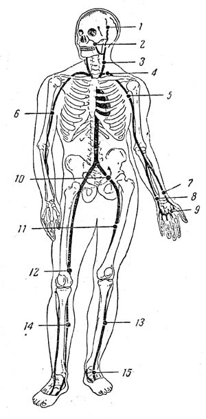 Рис. 2. Артерии и места их прижатия при кровотечении.