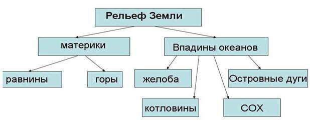 - Вспомните, какие формы рельефа вы знаете и заполните схему на доске. На доске учитель вывешивает схему из перевернутых карточек с терминами: