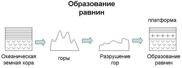 Образование равнин. Океаническая земная кора (мягкая и тонкая) легко сминается в складки, и на ее месте могут образоваться горы. Тогда породы, слагающие ее, поднимаются на высоту нескольких километров над уровнем моря. Происходит это в результате интенсивного сжатия. Мощность земной коры возрастает до 50 км.