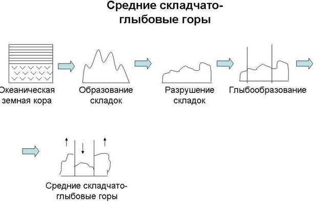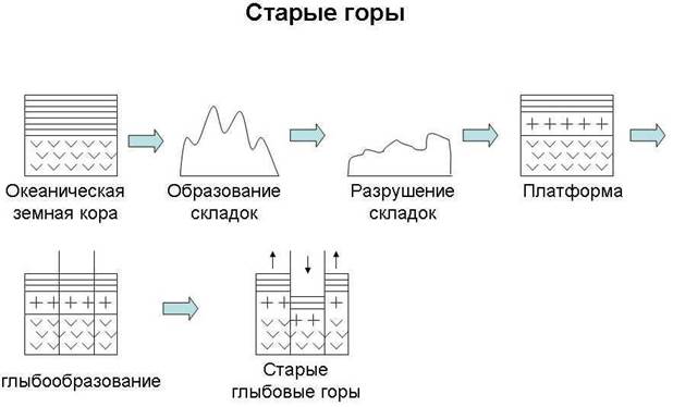 Рис. 3. Образование старых (глыбовых, возрожденных) гор