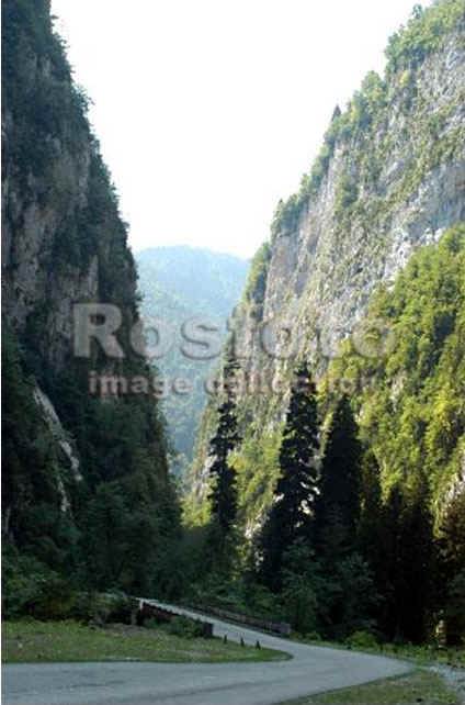 Рис. 13. Дорога в Абхазии к озеру Рица, проложенная по дну ущелья горной реки