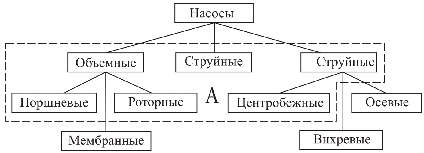 Насосы могут классифицироваться по назначению, конструктивному исполнению, величинам подачи перекачиваемой жидкости и напора, и т.д. На оперативных машинах пожарной и аварийно-спасательной службы применяются насосы всех трех видов (обозначенная область А на рис.3.1).