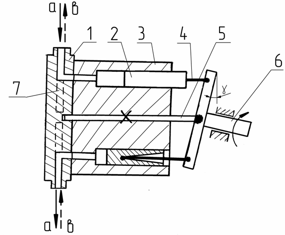 Аксиально-поршневые насосы (рис. 3.5). Несколько поршневых насосов 2 размещены в одном барабане 3, вращающемся на оси распределительного диска 1. Штоки поршней 4 шарнирно закреплены на диске, вращающемся на оси 5. При вращении вала 6 поршни перемещаются в осевом направлении и одновременно вращаются с барабаном.
