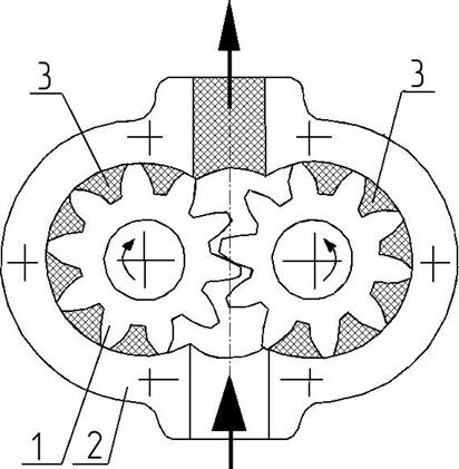 | Рис. 3.6. Шестеренчатый насос: 1 – зубчатое колесо; 2 – корпус; 3 – впадина |