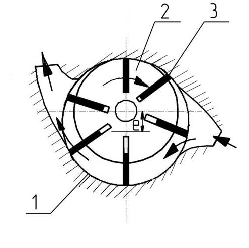 Ротор 2 размещен в гильзе 1 эксцентрично. При его вращении лопатки 3 под действием центробежной силы прижимаются к внутренней поверхности гильзы, образуя замкнутые полости. Всасывание происходит за счет изменения объема каждой полости при ее перемещении от всасывающего отверстия к выпускному.