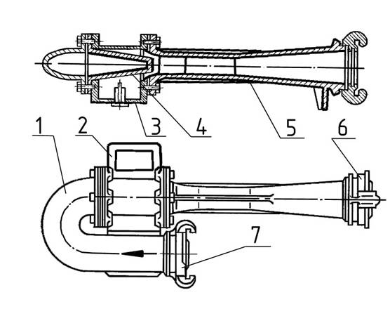 Рабочим телом этого насоса являются отработавшие газы двигателя внутреннего сгорания АЦ. Они поступают в сопло 1 высокого давления, затем в камеру 3 корпуса насоса 2, в камеру смешения 4 и диффузор 5. Как и в жидкостном эжекторе, в камере 3 создается разрежение.