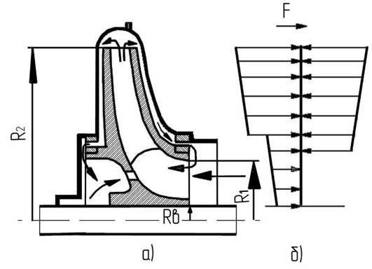Важным элементом в насосе является крепление вала. Это обусловлено особенностями конструкции рабочего колеса. Оно выполнено из двух дисков – ведущего и покрывающего. Между ними расположены лопасти, загнутые в сторону, противоположную вращению. Размеры дисков колеса различны (рис. 3.12, а). Это обусловливает возникновение осевой силы, которая направлена по оси в сторону всасывающего патрубка и стремится сместить колесо по оси (рис. 3.12, б). Величину этой силы приближенно вычисляют по формуле