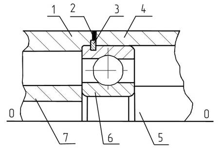 | Рис.3.13. Крепление подшипника: 1 – корпус привода тахометра; 2 – прокладка; 3 – полукольцо верхнее; 4 – корпус насоса; 5 – вал насоса; 6 – подшипник; 7 – втулка |