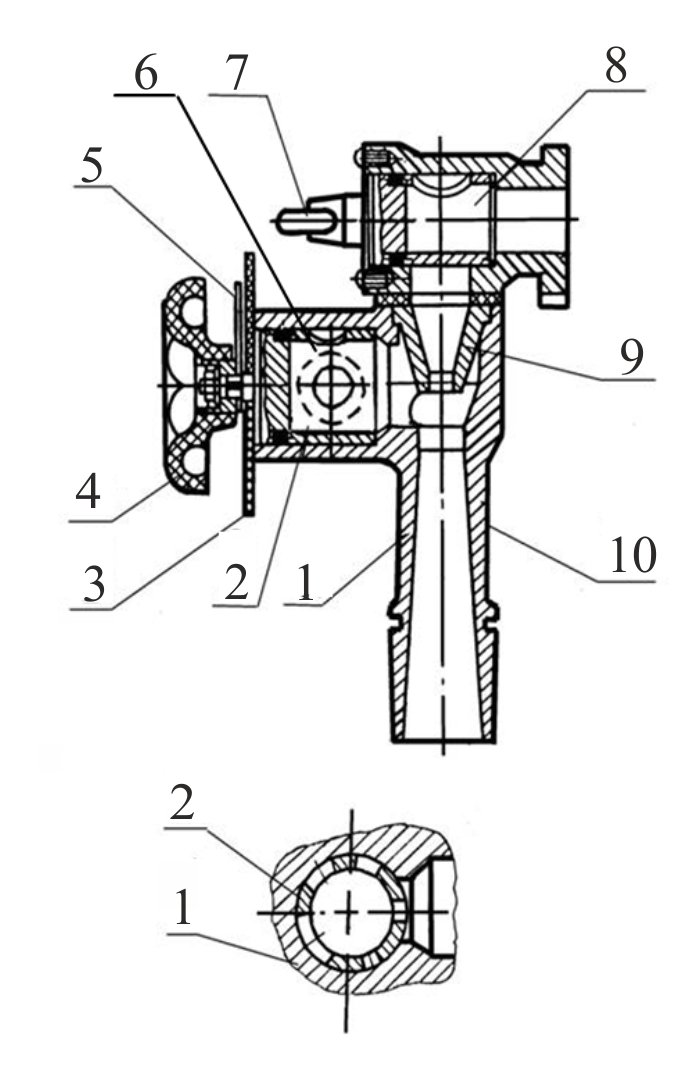 | Рис. 3.17. Пеносмеситель ПС-5: 1 – корпус; 2 – дозирующий кран; 3 – диск; 4 – маховичок; 5 – стрелка; 6 – отверстие в штуцере подвода; 7 – рукоятка; 8 – кран включения; 9 – сопло; 10 – диффузор |