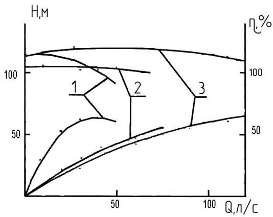 | Рис. 3.18. Рабочие характеристики насосов: 1 – ПН-40УВ; 2 – ПН-60; 3 – ПН-110 |