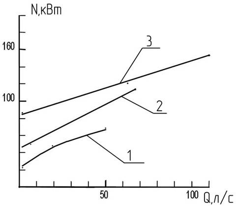 | Рис. 3.19. Мощность, потребляемая насосом: 1 – ПН-40УВ; 2 – ПН-60; 3 – ПН-110 |