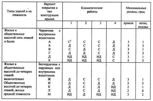 Таблица 2. Конструкции железобетонных крыш и их уклоны в зависимости от типа здания и климатических условий района строительства
