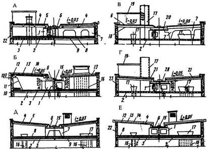 Рис. 1. Схемы конструкций чердачных крыш:А, Б - с холодным чердаком с рулонной (А) и безрулонной (Б) кровлей; В, Г - с теплым чердаком с рулонной (В) и безрулонной (Г) кровлей; Д, Е - с открытым чердаком с рулонной (Д) и безрулонной (Е) кровлей; 1 - опорный элемент; 2 - плита чердачного перекрытия; 3 - утеплитель; 4 - неутепленная кровельная плита; 5 - рулонный ковер; 6 - водосборный лоток; 7 - опорная рама; 8 - защитный слой; 9 - пароизоляционный слой; 10 - полоса рубероида; 11 - опорный элемент фризовой панели; 12 - кровельная плита безрулонной крыши; 13 - гидроизоляционный слой из мастичных или окрасочных составов; 14 - П-образная плита - нащельник; 15 - водосточная воронка; 16 - вентиляционный блок (шахта); 17 - оголовок вентиляционного блока; 18 - легкобетонная однослойная кровельная плита; 19 - машинное отделение лифта; 20 - легкобетонная плита лотка; 21 - двухслойная кровельная плита; 22 - неутепленная фризовая панель; 23 - утепленная фризовая панель