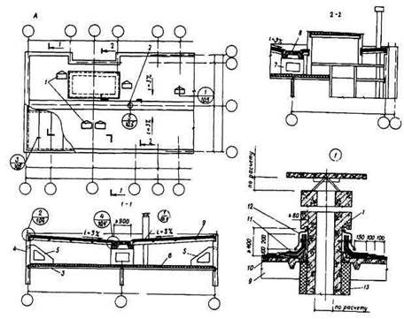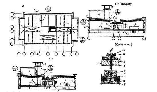 А - схема-план, крыши: 1 - двухслойная теплая безрулонная кровельная панель; 2 - вытяжная шахта; 3 - защитный зонт; 4 - двухслойная лотковая панель; 5 - фризовая панель; 6 - оголовок вентиляционной шахты: 7 - опорный элемент лотковой панели; 8 -стояк внутреннего водостока; 9 - водосборный лоток; 10 - трехслойная кровельная панель; 11 - то же, панель лотка; 12 - панель чердачного перекрытия; 13 - бетонный нащельник; 14 - герметизирующая мастика; 15 -утеплитель; 16 - бетонная шпонка.
