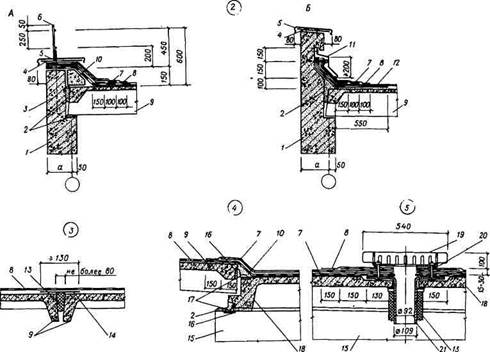 Рис.5. Узлы 2-4 сопряжений конструкций рулонной крышн с холодным чердаком (тип А): А - вариант решения карнизного узла с решетчатым ограждением; Б - то же, с парапетом; 1 - фризовая панель; 2 цементно-песчаный раствор; 3 - анкерный выпуск; 4 - кровельные костыли через 600 мм пристрелены дюбелями; 5 - оцинкованная кровельная сталь; 6 - стойка ограждения; 7 - дополнительные два слоя рубероида на битумной мастике; 8 - основная кровля; 9 - ребристая железобетонная кровельная панель; 10 - бетонный бортовой камень; 11 - защитный фартук из оцинкованной кровельной стали; 12 - скользящая полоса рулонного материала; 13 - маты минераловатные; 14 - полоса из рулонного материала с односторонней приклейкой на ширину 50 мм; 15 - опорная рама; 16 - закладная деталь; 17 - монтажный соединительный элемент; 18 -лотковая панель; 19 - водосточная воронка; 20 - заливка герметизирующей мастикой; 21 - труба спускная водосточной воронки