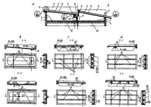 Рис.6. Безрулонная крыша с холодным чердаком (тип Б): А, Б - схемы поперечных сечений чердака при внутреннем и наружном водоотводе; В - сборного элемента водосборного лотка; Г - то же, кровельных панелей для крыш с внутренним; Д - то же, с наружным неорганизованным водоотводом ; 1 - фризовая панель; 2 - опорный элемент фризовой панели; 3 - решетчатое ограждение крыши; 4 - фризовая панель торцевой стены; 5 - кровельная панель; 6 - нащельник; 7 - водосборный лоток; 8 - водосборная воронка; 9 -опорная балка; 10 - чердачное перекрытие; 11 - опорный столбик; 12 - опорный элемент лотка; 13 - сливное отверстие; 14 - монтажные петли