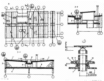 А - схема-план крыши, 2 - водосточная воронка; 3 - опорный элемент фризовой панели; 4 - фризовая панель; 5 - кровельная панель; 6 - лотковая панель; 7 - опорная рама; 8 - вентиляционная труба; 9 - утепляющий вкладыш; 10 - основная кровля; 11 - скользящая полоса рулонного материала; 12 - цементно-песчаный раствор