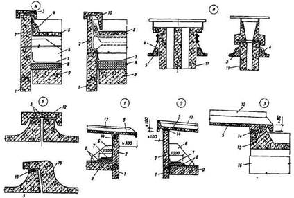 А - варианты сопряжений крыши с торцевой наружной стеной; Б - варианты продольных стыков кровельных панелей; В - варианты конструкций сопряжений вентиляционных шахт с крышей; 1 - панель наружной стены; 2 - фризовая панель торцевой стены; 3 - парапетная плита; 4 - фартук из оцинкованной стали; 5 - кровельная панель; 6 -опорный элемент фризовой панели; 7 - полоса рубероида; 8 - утеплитель; 9 - плита чердачного перекрытия; Ю - Г-образный парапетный элемент; И - вентиляционная шахта; 12 - нащельник; 13 - герметик; 14 - цементный раствор; 15 - водосборный лоток; 16 - опорный элемент лотка