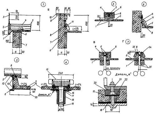 А,Б - варианты конструкции ограждения крыши; В, Г, - варианты конструкции деформационного шва; 1 - кровельная панель; 2 - анкерный выпуск; 3 - стойка ограждения; 4 - П-образная плита - нащельник; 5 -гидроизоляция мастичными или окрасочными составами; 6 - цементно-песчаный раствор; 7 - фризовая панель; 8 - герметик; 9 - кровельные костыли шагом 600 мм; 10 - оцинкованная кровельная сталь; 11 - защитный фартук из оцинкованной стали; 12 - закладная деталь; 13 - стальной соединительный элемент; 14 - лотковая панель; 15 - водосточная воронка; 16 - уплотняющая прокладка из пористой резины; 17 - зажимный хомут воронки; 18- маты минераловатные прошивные; 19- труба спускная водосточной воронки; 20 - мастика изоляционная битумно-резиновая; 21 - шпилька; 22 - металлическая шайба; 23 - стальная полоса; 24 - компенсатор из оцинкованной кровельной стали; 25 - внутренние панели чердака.