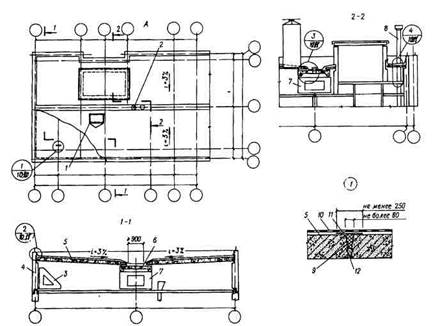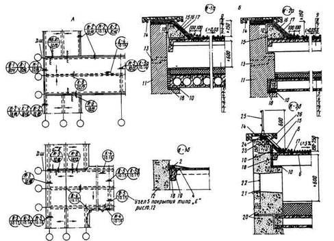 А - схема-план крыши; 1 - кровельная панель; 2 - водосточная воронка; 3 - вентиляционный блок; 4 - панель чердачного перекрытия; 5 - опорный элемент фризовый панели; 6 - лотковая панель; 7 - П-образная плита - нащель-ник; 8 - утеплитель; 9 - железобетонная опорная рама; 10 - цементно-песчаный раствор; 11 - герметик; 12 -оголовок вентиляционного блока
