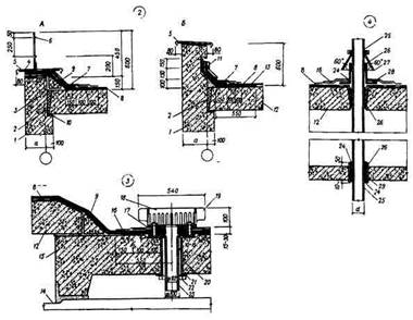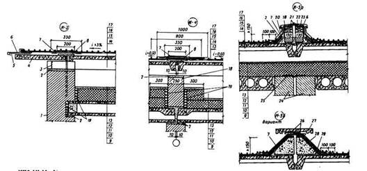 14 - опорная рама; 15 - лотковая панель; 16 - два дополнительных слоя кровли из мастик, армированных стекло-сеткой или стеклотканью; 17 - заливка битумной мастикой; 18 - чаша водосточной воронки; 19 - струевыпря-митель; 20 - гильза из асбестоцементной трубы d=150 мм; 21 - резиновая прокладка; 22 - зажимной хомут; 23 - труба спускная водосточной воронки; 24 - заливка герметизирующей мастикой; 25 - вентиляционная шахта; 26 - пакля, смоченная в горячем битуме на глубину 50 мм; 27 - зонт из оцинкованной кровельной стали; 28 - стальной патрубок с фланцем; 29 - плита чердачного перекрытия
