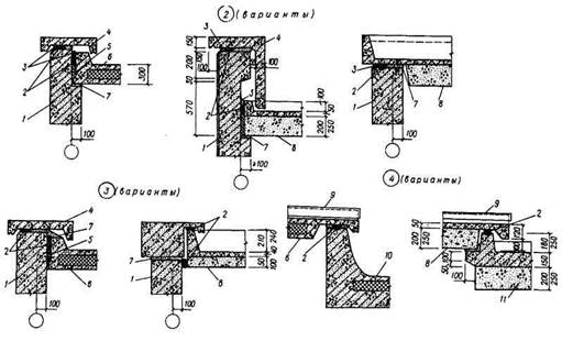 Б - варианты конструкции ограждения крыши; 1 -фризовая панель; 2 - утепляющий вкладыш; 3 - анкерный выпуск; 4 - кровельные костыли шагом 600 мм; 5 - оцинкованная кровельная сталь; 6 - стойка ограждения; 7 - три дополнительных слоя рубероида; 8 - основная кровля; 9 - бетонный бортовой камень; 10 - цементно-песчаный раствор; 11 - защитный фартук из оцинкованной кровельной стали;