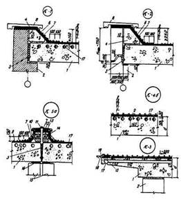 Рис. 16. Бесчердачная крыша из легкобетонных панелей типа "К":Узлы К-1, К-2, К-3, К-4 и К-5; 1 - легкобетонная панель покрытия; 2 - наружная стена; 3 - минераловатный войлок; 4 - бортовой бетонный камень; 5 - три слоя прокладочного рубероида; 6 - слой бронированного рубероида; 7 - два дополнительных слоя рубероида; 8 - парапетная плита; 9 - защитный слой мелкого гравия 20-25 мм; 10 - фартук из кровельной оцинкованной стали; 11 - верхний компенсатор из кровельной оцинкованной стали; 12 - антисептированная деревянная доска; 13 - антисептированная деревянная пробка; 14 - кирпичная стенка; 15 - внутренние стены; 16 - нижний компенсатор из кровельной оцинкованной стали; 17 - вентиляционный канал; 18 - кровельный костыль; 19 - кровельная оцинкованная сталь.