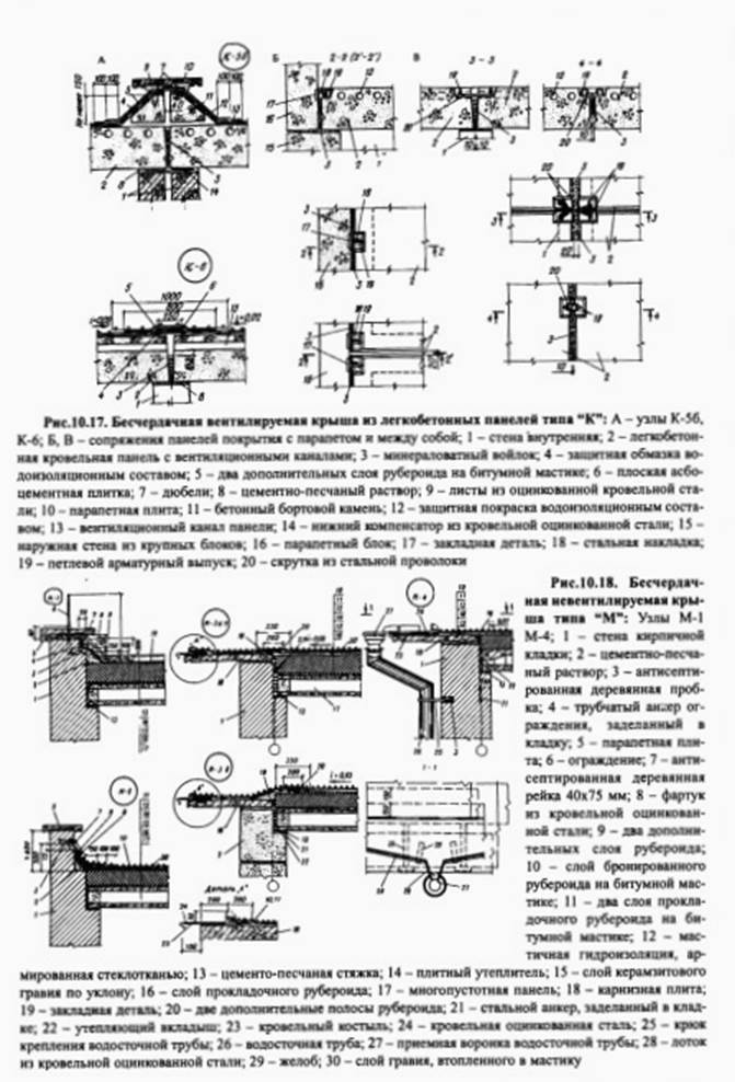 Бесчердачные совмещенные крыши однослойной конструкции проектируют панельными из легкого бетона или из автоклавного ячеистого бетона (конструкция типа К). Легкий бетон кровельных панелей плотностью до 1200 кг/м2, ячеистый бетон -800 кг/м2. В панелях предусматривают цилиндрические вентиляционные каналы в подкровельном слое. Кровля - рулонная четырехслойная, причем первый слой гидроизоляции выполняют в заводских условиях во избежание увлажнения конструкции при транспортировании, складировании и монтаже.