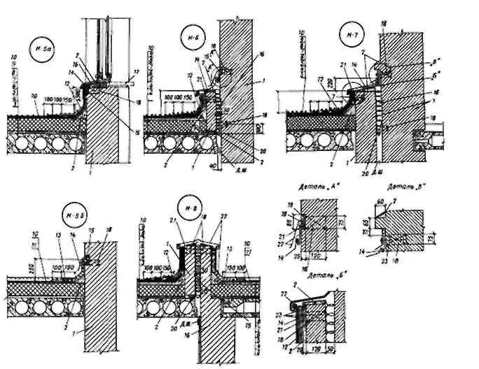 узлы М-5а - М-8; 1 - кирпичная стена; 2 - цементно-песчаный раствор; 3 - многопустотная железобетонная панель; 4 - слой прокладочного рубероида на битумной мастике; 5 - слой керамзитового щебня или шлака для создания уклона кровли; 6 - плитный утеплитель; 7 - цементно-песчаная стяжка; 8 - три слоя прокладочного рубероида на битумной мастике; 9 -слой бронированного рубероида; 10 - защитный слой из мелкого гравия 20-25 мм; 11 - мастичный водоизоля-ционный ковер, армированный стеклохолстом; 12 - три дополнительных слоя рубероида; 13 - три дополнительных мастичных слоя армированных двумя слоями стеклохолста; 14 - фартук из кровельной оцинкованной стали; 15 - антисептированная рейка по всей длине; 16 - минераловатный войлок; 17 - подоконная доска; 18 - антисептированная деревянная пробка; 19 - мастика; 20 - компенсатор из кровельной оцинкованной стали; 21 - антисептированная деревянная доска 19x150 мм по всей длине; 22 - кровельная оцинкованная сталь; 23 – дюбели.