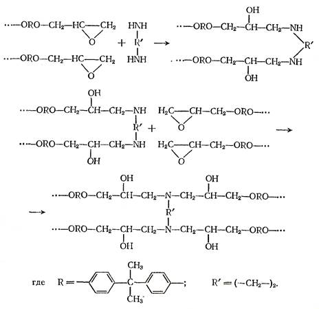 Отверждение аминами. Реакция с первичными аминами протекает с выделёниём тепла и большой скоростью. Отверждение первичными аминами описывается уравнением: