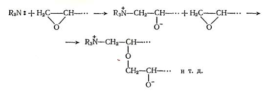 При отверждении третичными аминами происходит полимеризация α-окисного цикла, протекающая по ионному механизму. Третичные амины, как и их комплексы с BF3, отверждают эпоксидные олигомеры путем ионной полимеризации по эпоксидным группам. В присутствии третичных аминов отверждение протекаeт, например, по следующей схеме: