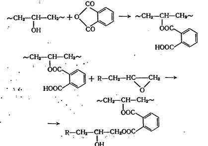 При отверждении ангидридами дикарбоновых кислот, например фталевым, вначале с ангидридом реагируют гидроксильные группы олигомера, а затем образовавшиеся карбоксильные группы взаимодействуют с эпоксидными: