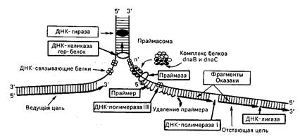 Первоначально происходит ферментативный биосинтез на матрице ДНК необычного затравочного олигорибонуклеотида (праймера) со свободной группой у С-3/ рибозы. При инициации к цепям ДНК последовательно присоединяются ДНК-раскручивающие и ДНК-связывающие белки, а затем комплексы ДНК-полимераз и праймаз.
