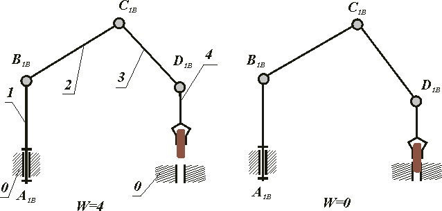 В процессе работы кривошипно-ползунного механизма насоса его структурная схема все время остается неизменной. В механизмах манипуляторов в процессе работы структурная схема механизма может изменяться. Так если промышленный робот выполняет сборочные операции , например, вставляет цилиндрическую деталь в отверстие, то при транспортировке детали его манипулятор является механизмом с открытой или разомкнутой кинематической цепью. В тот момент когда деталь вставлена в отверстие, кинематическая цепь замыкается , структура механизма изменяется, подвижность уменьшается на число связей во вновь образованной кинематической паре деталь-стойка.