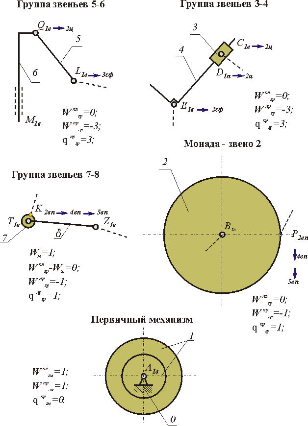 Проведем структурный анализ плоского механизма, схема которого приведена на рис. 2.4, и представим его в виде совокупности первичного механизма и структурных групп Ассура. Результаты структурного анализа изображены на рис. 2.9. Для рассматриваемого механизма структурный анализ можно проводить только для плоской модели, так как она не содержит избыточных связей. Механизм состоит из четырех структурных групп: двух рычажных двухповодковых ( группы звеньев 5-6 и 4-5) и двух групп с высшими парами одна из которых содержит только одно звено 2, вторая - два звена 7 и 8. Звено 7 и пара T введены в структуру механизма с целью замены трения скольжения трением качения, т.е. они обеспечивают местную подвижность ролика 7. За вычетом этой подвижности группа 7-8 имеет нулевую подвижность и является группой Ассура (точнее группой нулевой подвижности). Механизм имеет одну основную подвижность и, следовательно, один первичный механизм, состоящий из звеньев 1 и 0. Если рассмотреть полученные структурные группы как пространственные, то они не будут группами нулевой подвижности ибо обладают избыточными связями. Чтобы преобразить их в группы с нулевой подвижностью необходимо снизить классы кинематических пар, не допуская при этом возникновения местных подвижностей. При переходе от анализа механизма на плоскости к анализу в пространстве изменяются классы пар: одноподвижная поступательная КП D изменяется на двухподвижную цилиндрическую, двухподвижные высшие P и K на четырехподвижные. Далее по группам классы пар изменялись так: