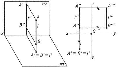 Отметим проецирующие свойства таких прямых – совпадают с направлением проецирующих прямых, на перпендикулярную к ним плоскость проекций проецируются в точку.