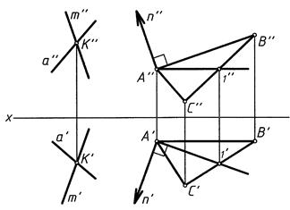 Построение на чертеже перпендикулярных плоскостей основано на использовании признака перпендикулярности двух плоскостей и теоремы о проецировании прямого угла (в этом случае следует использовать горизонталь и фронталь).