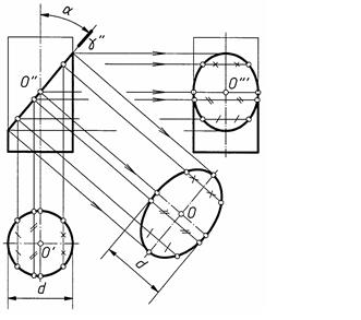 - на фронтальную плоскость проекций в отрезок прямой, заключенный между очерковыми образующими и совпадающий с проекцией плоскости γ. Этот отрезок равен действительной длине большой оси эллипса. Центр эллипса (точка О) находится в середине большой оси и на пересечении оси вращения цилиндра с плоскостью эллипса. С точкой О" совпадает фронтальная проекция малой оси эллипса, равная диаметру цилиндра;