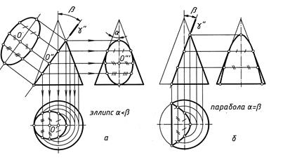 На рис. 5 показаны примеры построения пересечения конуса плоскостями
