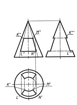 Сквозное отверстие ограничено по высоте двумя горизонтальными плоскостями, которые пересекают поверхность конуса по двум дугам окружностей между точками К и М и точками L и N. Обозначения присвоены только тем проекциям точек, которые видимы на проекциях фигуры. Две боковые плоскости отверстия проходят через вершину конуса и пересекают его поверхность по образующим. Часть образующих конуса вырезана сквозным отверстием, поэтому очерк конуса на профильной плоскости проекций приобретает вид ломаной линии.