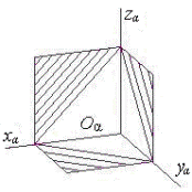 На рис. 8 показано построение направлений линий штриховки в изометрии. Для этого на осях xα, yα, zα (или линиях, им параллельным) откладывают равные отрезки произвольной длины и соединяют их концы.