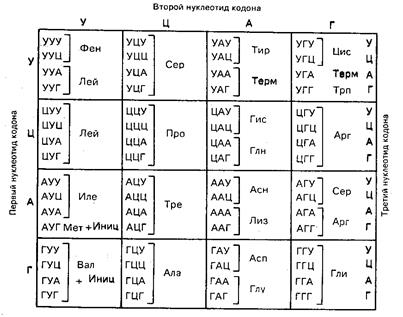 В таблице 12 представлены последовательности триплетов всех кодонов, ответственных за включение каждой из 20 аминокислот в белковую молекулу.