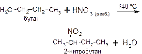 При нитровании гомологов метана, так же как и при бромировании, в первую очередь замещается атом водорода у третичного атома углерода, затем - у вторичного, и в последнюю очередь – у первичного. Например, при нитровании бутана преимущественно образуется продукт замещения атома водорода у вторичного атома углерода: