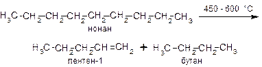 Разрыв связей между атомами углерода в молекулах алканов происходит при температурах выше 400 оС. Этот процесс носит название крекинг (от англ. to crack – давать трещину, расщепляться). При крекинге алканов образуется смесь алканов и алкенов с меньшим числом углеродных атомов, например: