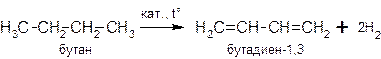 Дегидрирование алканов (отщепление водорода) ‑ обратимый каталитический процесс. В качестве катализаторов используют металлы платиновой группы (Pt, Pd, Ni) или Cr2O3, нанесенный на пористый инертный носитель. Температура варьируется от 300 до 600 оС. В зависимости от условий образуются алкены или алкадиены: