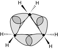 Склонность малых циклов, особенно циклопропана, к раскрытию и реакциям присоединения объясняют особенностями химических связей между атомами углерода в их молекулах. Рассмотрим в качестве примера строение молекулы циклопропана. Исходя из того, что трехчленный цикл является плоским равносторонним треугольником, валентные углы между атомами углерода должны быть равными 60о, то есть существенно отличаться по величине от соответствующего sp3-гибридизации тетраэдрического угла. Такого сильного искажения валентного угла в действительности не происходит: электронные облака, связывающие атомы углерода, перекрываются не на прямой, соединяющей ядра, а вне ее (рис. 4). Поскольку в этом случае максимальная электронная плотность располагается вне линии, соединяющей ядра атомов, образовавшаяся связь приобретает частично ненасыщенный характер и становится похожей на π-связь в алкенах. Связи такого типа называют «банановыми».