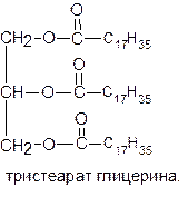 Особенно важны в практическом отношении сложные эфиры глицерина. Так, сложные эфиры глицерина и высших карбоновых кислот (например, стеариновой С17Н35-СООН, олеиновой С17Н33-СООН) представляют собой жиры, примером которых может служить тристеарат глицерина – твердый жир животного происхождения: